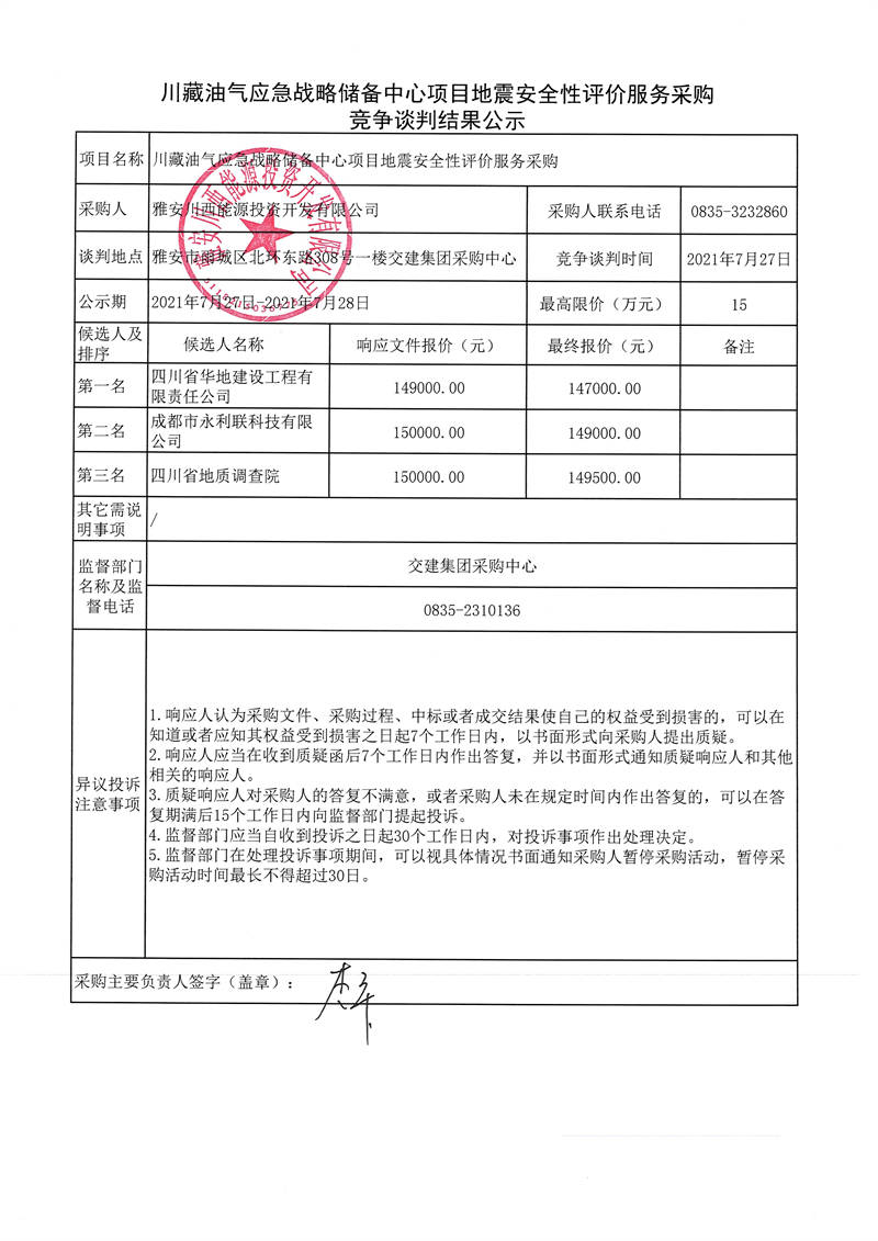 雅安川西能源投資開發(fā)有限公司川藏油氣應急戰(zhàn)略儲備中心項目地震安全性評價服務采購競爭談判結(jié)果公示