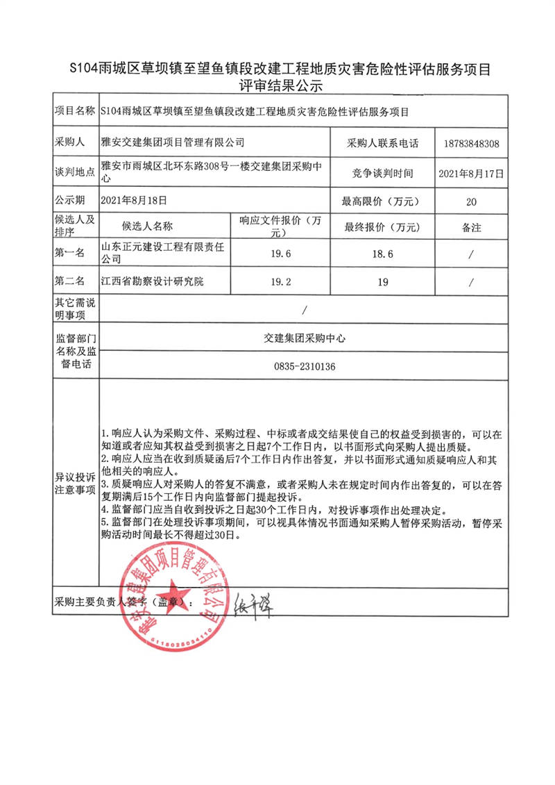 雅安交建集團項目管理有限公司S104雨城區(qū)草壩鎮(zhèn)至望魚鎮(zhèn)改建工程地質(zhì)災害危險性評估服務項目評審結(jié)果公示