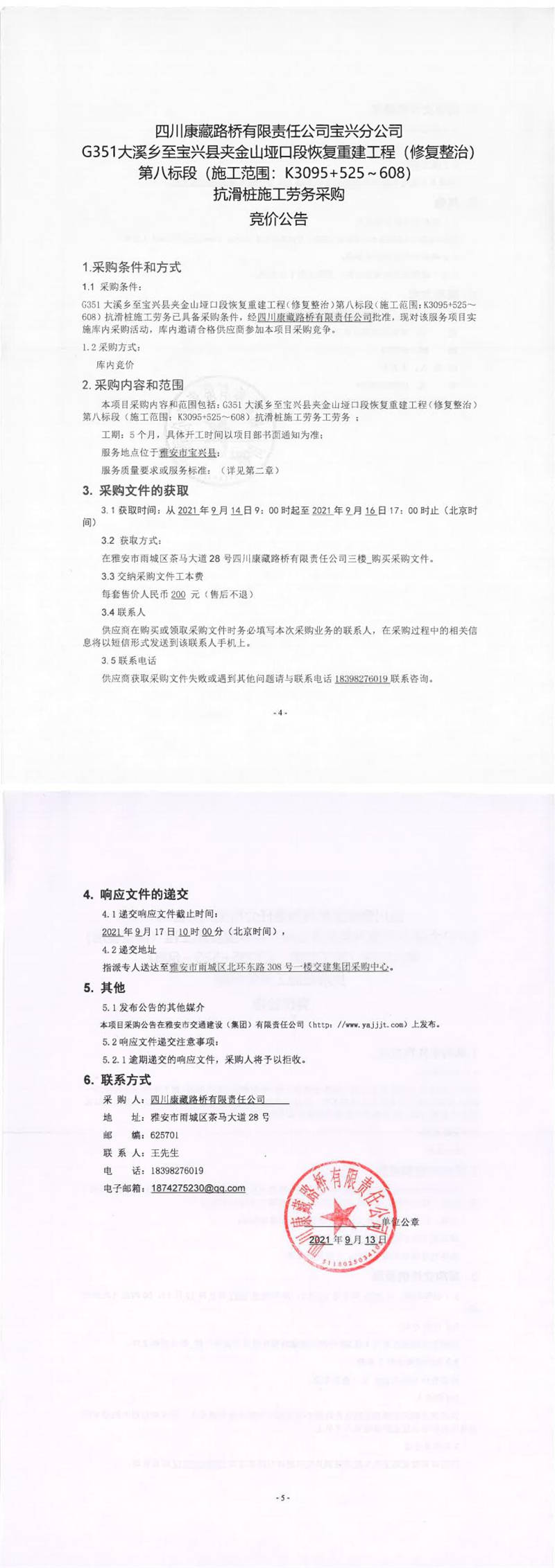四川康藏路橋有限責任公司寶興分公司G351大溪鄉(xiāng)至寶興縣夾金山埡口段恢復重建工程(修復整治)第八標段(施工范圍:K3095+525-608)抗滑樁施工勞務(wù)采購競價公告