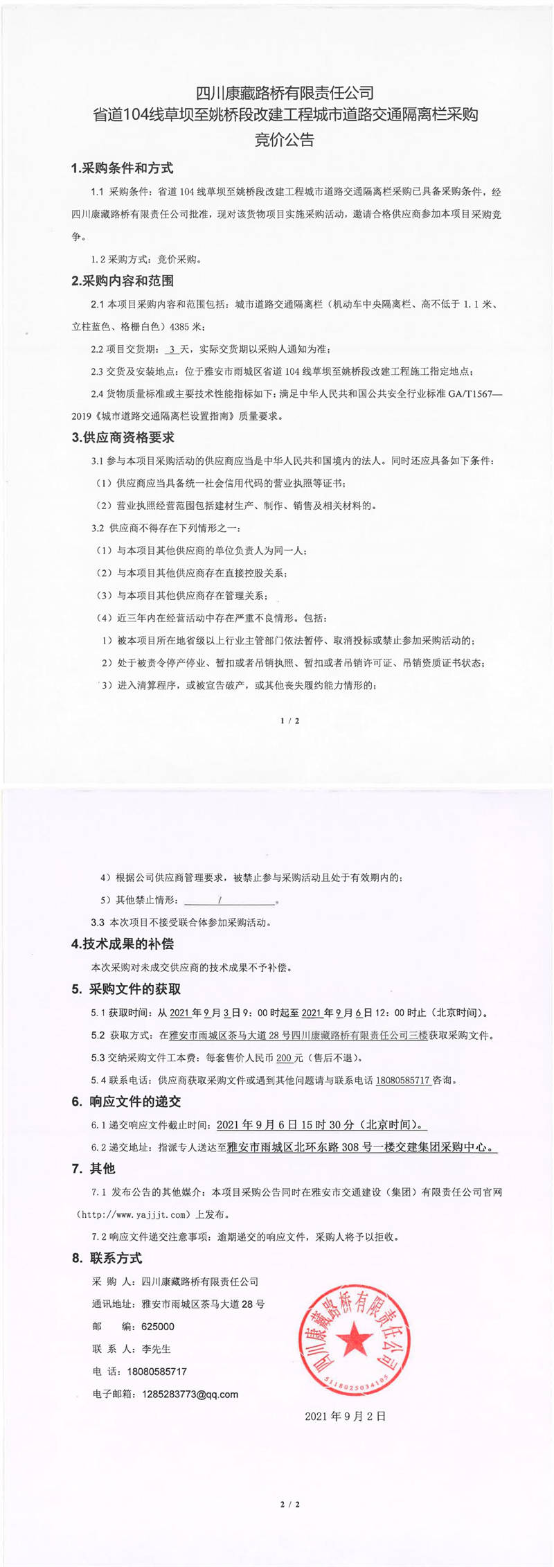 四川康藏路橋有限責(zé)任公司省道104線草壩至姚橋段改建工程城市道路交通隔離欄采購競價(jià)公告