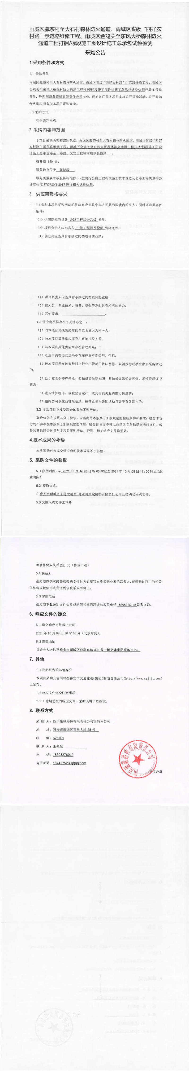 四川康藏路橋有限責(zé)任公司雨城區(qū)藏茶村至大石村森林防火通道、雨城區(qū)省級(jí)“四好農(nóng)村路”示范路維修工程、雨城區(qū)金雞關(guān)至東風(fēng)大橋森林防火通道工程打捆/標(biāo)段施工圖設(shè)計(jì)施工總承包試驗(yàn)檢測(cè)采購(gòu)公告