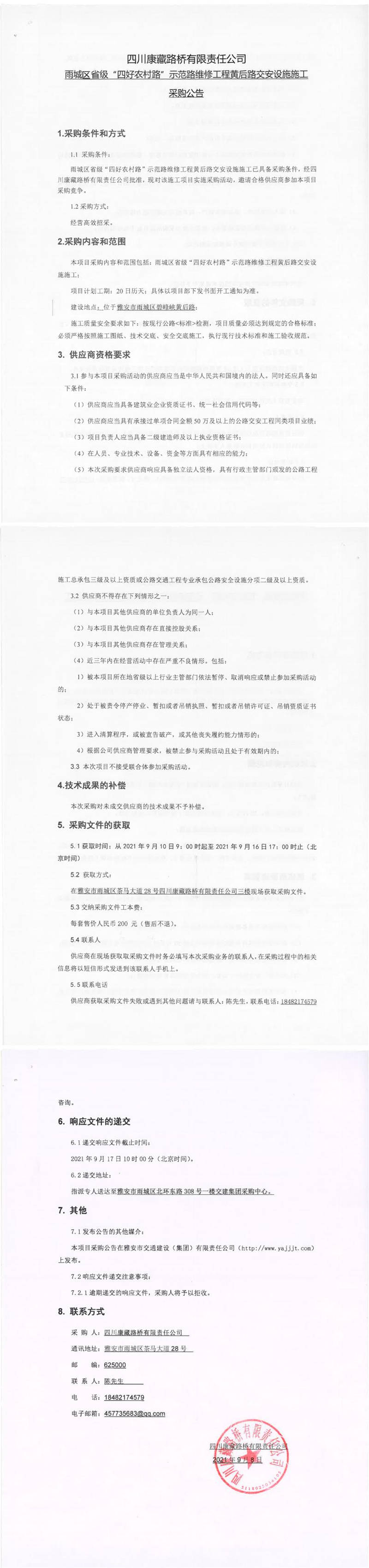 四川康藏路橋有限責(zé)任公司雨城區(qū)省級(jí)“四好農(nóng)村路”示范路維修工程黃后路交安設(shè)施施工采購公告