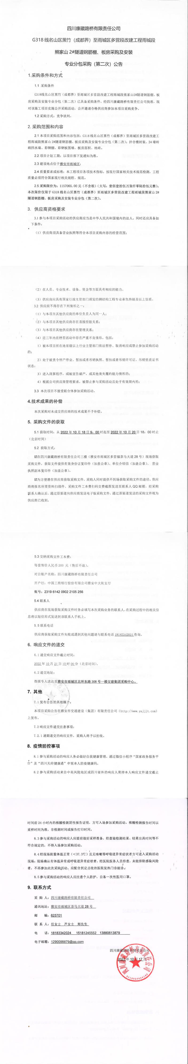 四川康藏路橋有限責(zé)任公司G318線名山區(qū)黑竹(成都界)至雨城區(qū)多營(yíng)段改建工程雨城段熊家山2#隧道鋼筋棚、板房采購及安裝專業(yè)分包采購(第二次)公告
