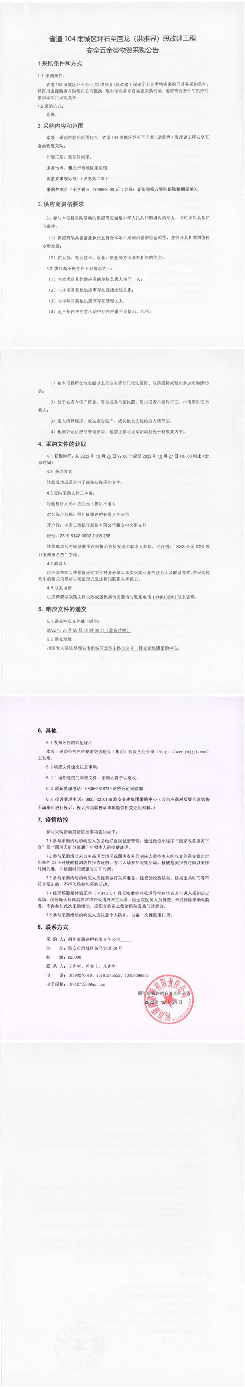 四川康藏路橋有限責(zé)任公司省道104雨城區(qū)坪石至回龍(洪雅界)段改建工程安全五金類物資采購公告