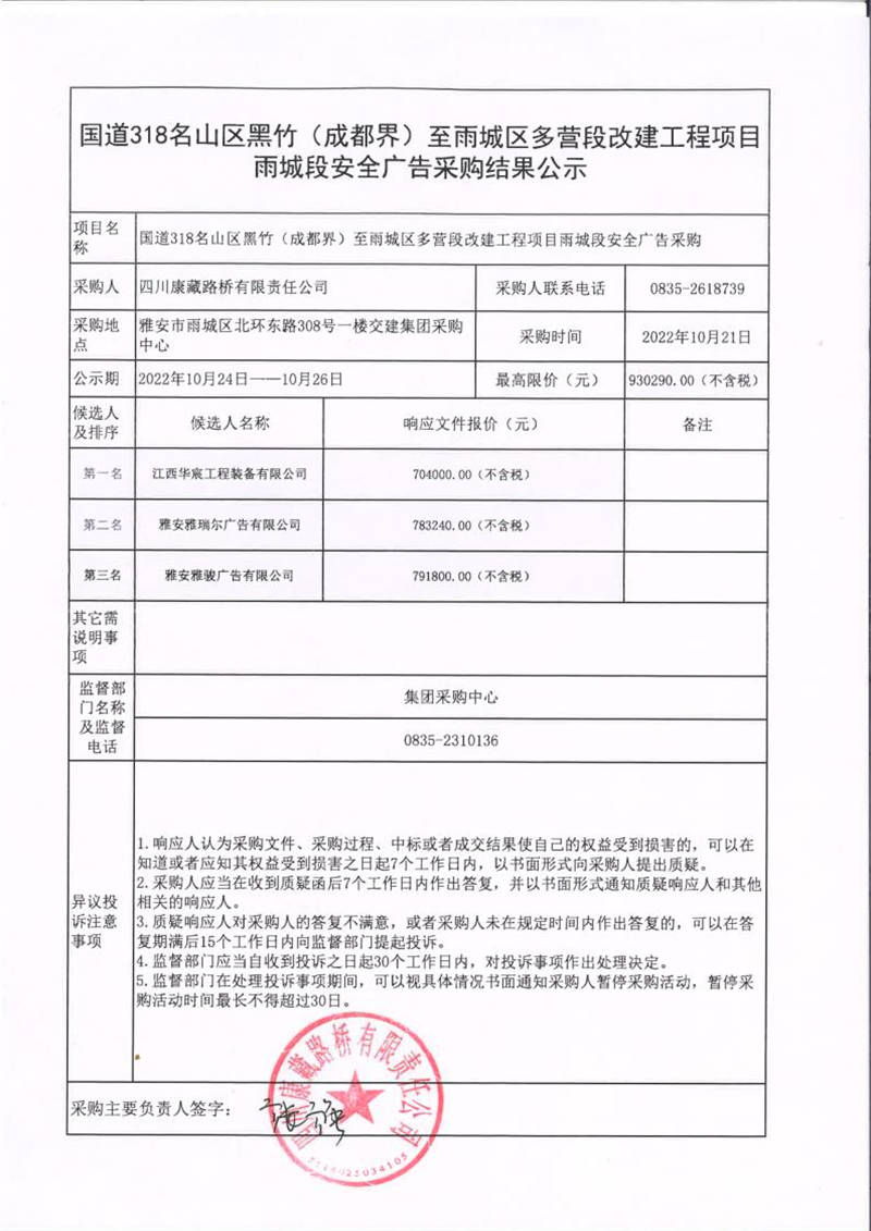 四川康藏路橋有限責(zé)任公司國(guó)道318名山區(qū)黑竹(成都界)至雨城區(qū)多營(yíng)段改建工程項(xiàng)目雨城段安全廣告采購(gòu)結(jié)果公示