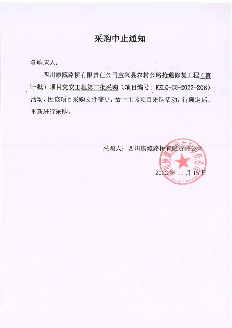 四川康藏路橋有限責任公司寶興縣農(nóng)村公路搶通修復工程(第一批)項目交安工程第二批采購中止通知