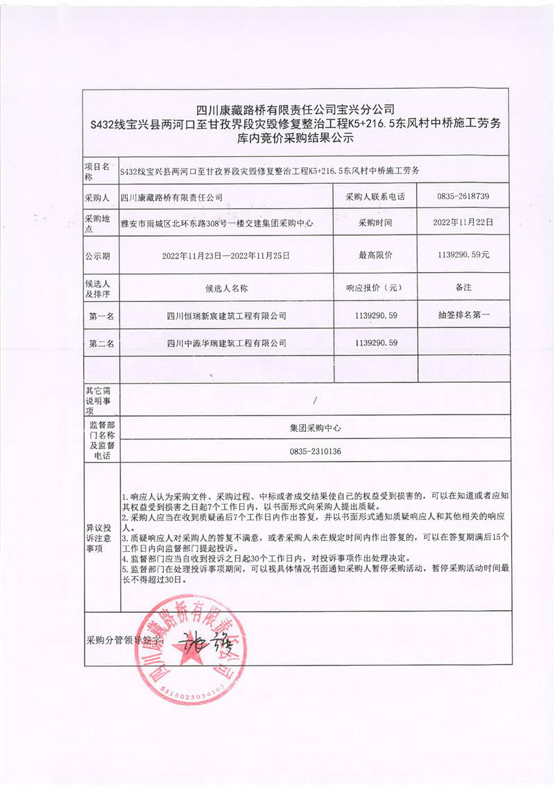 四川康藏路橋有限責任公司寶興分公司S432線寶興縣兩河口至甘孜界段災毀修復整治工程K5+216.5東風村中橋施工勞務庫內競價采購結果公示
