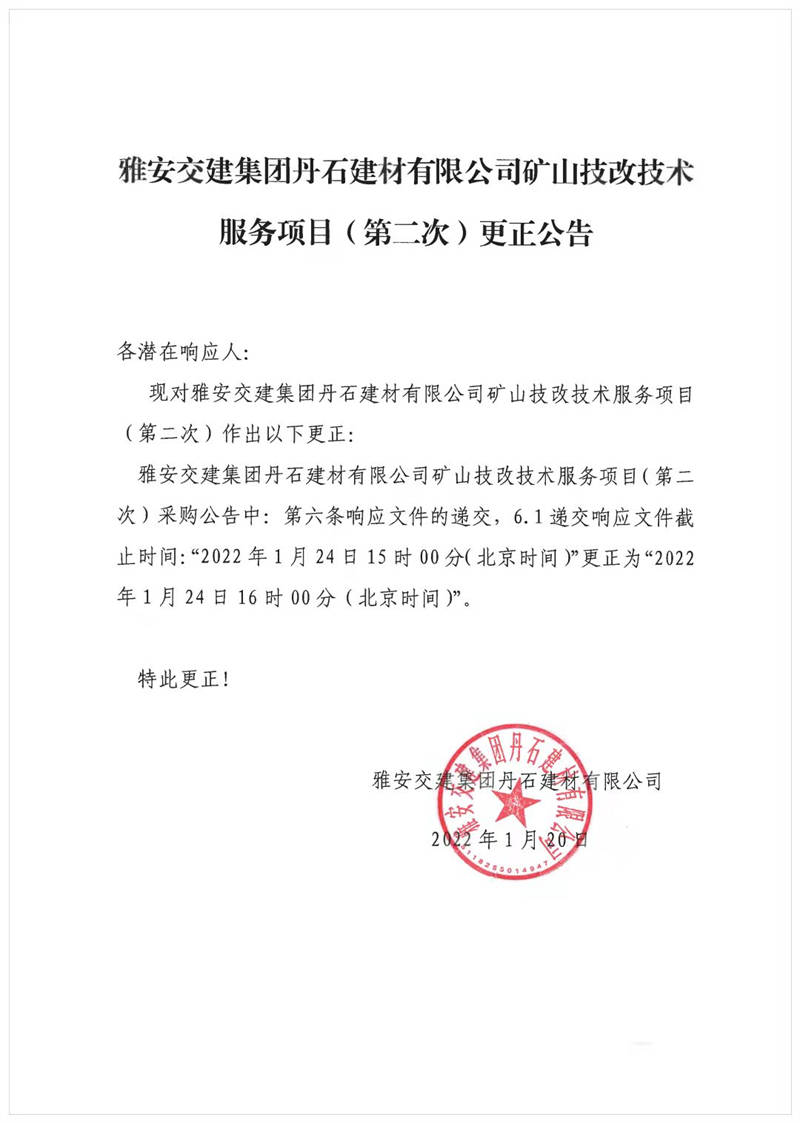 雅安交建集團丹石建材有限公司礦山技改技術服務項目(第二次)更正公告
