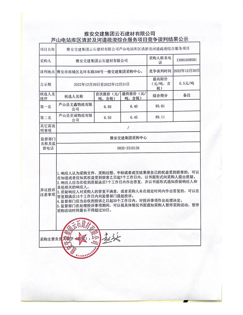 雅安交建集團云石建材有限公司蘆山電站庫區(qū)清淤及河道疏浚綜合服務項目競爭談判結(jié)果公示
