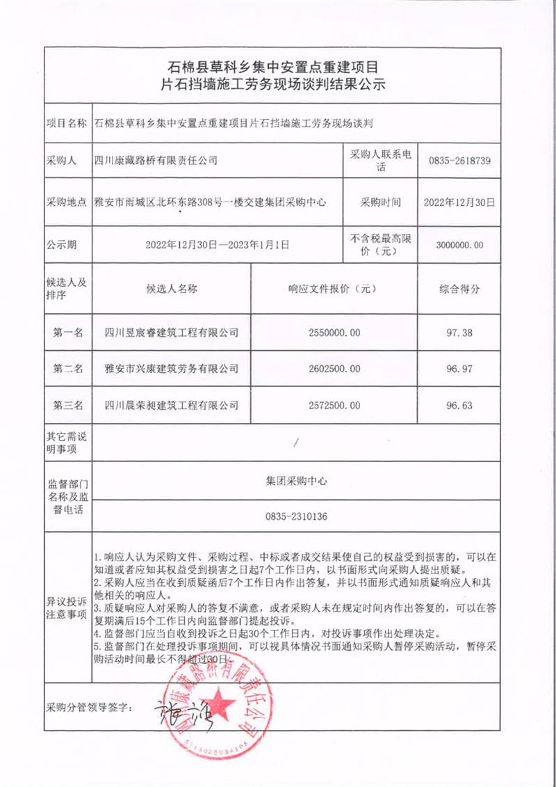 四川康藏路橋有限責(zé)任公司石棉縣草科鄉(xiāng)集中安置點(diǎn)重建項(xiàng)目片石擋墻施工勞務(wù)現(xiàn)場談判結(jié)果公示