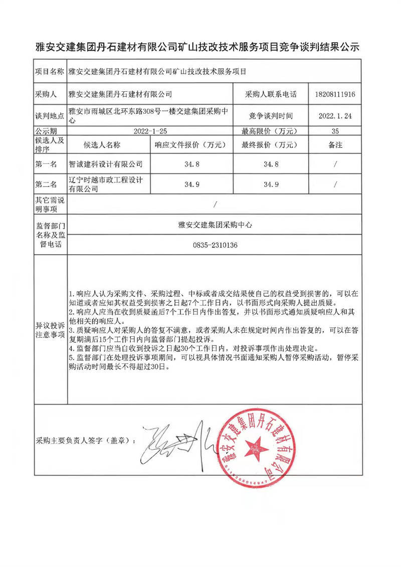 雅安交建集團丹石建材有限公司礦山技改技術服務項目競爭談判結果公示