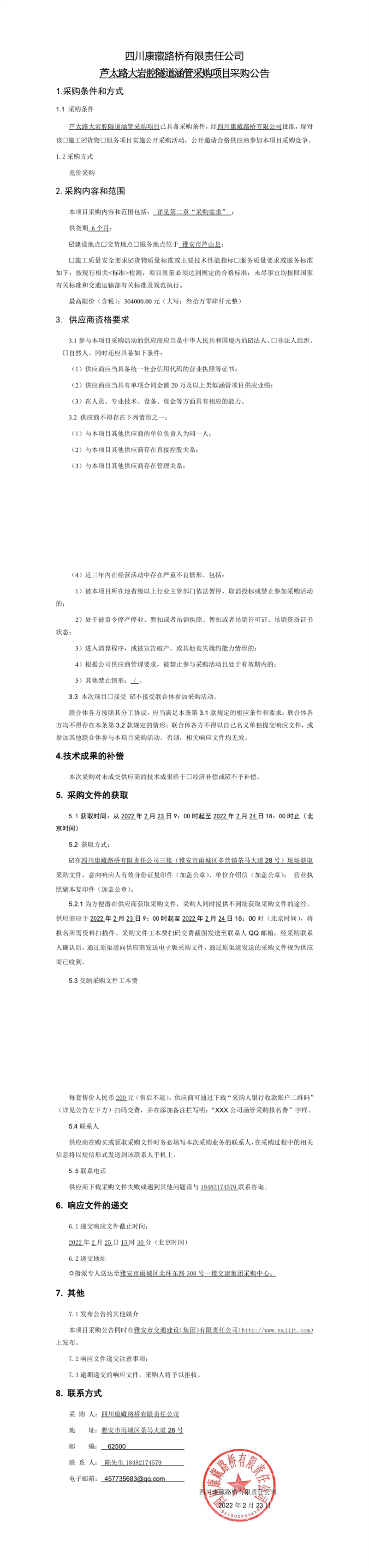 四川康藏路橋有限責(zé)任公司蘆太路大巖腔隧道涵管采購項目采購公告