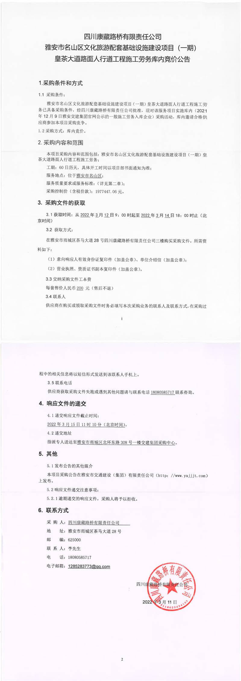 四川康藏路橋有限責(zé)任公司雅安市名山區(qū)文化旅游配套基礎(chǔ)設(shè)施建設(shè)項(xiàng)目(一期)皇茶大道路面人行道工程施工勞務(wù)庫內(nèi)競價(jià)公告