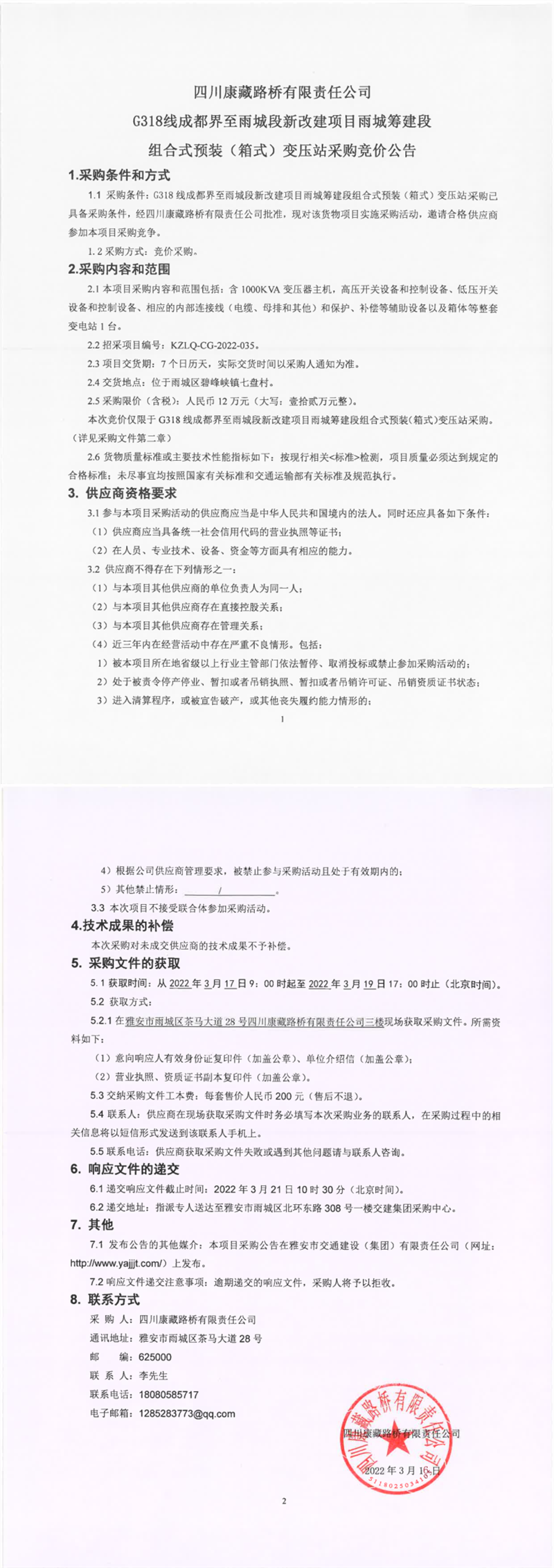 四川康藏路橋有限責(zé)任公司G318線成都界至雨城段新改建項(xiàng)目雨城籌建段組合式預(yù)裝(箱式)變壓站采購競價(jià)公告
