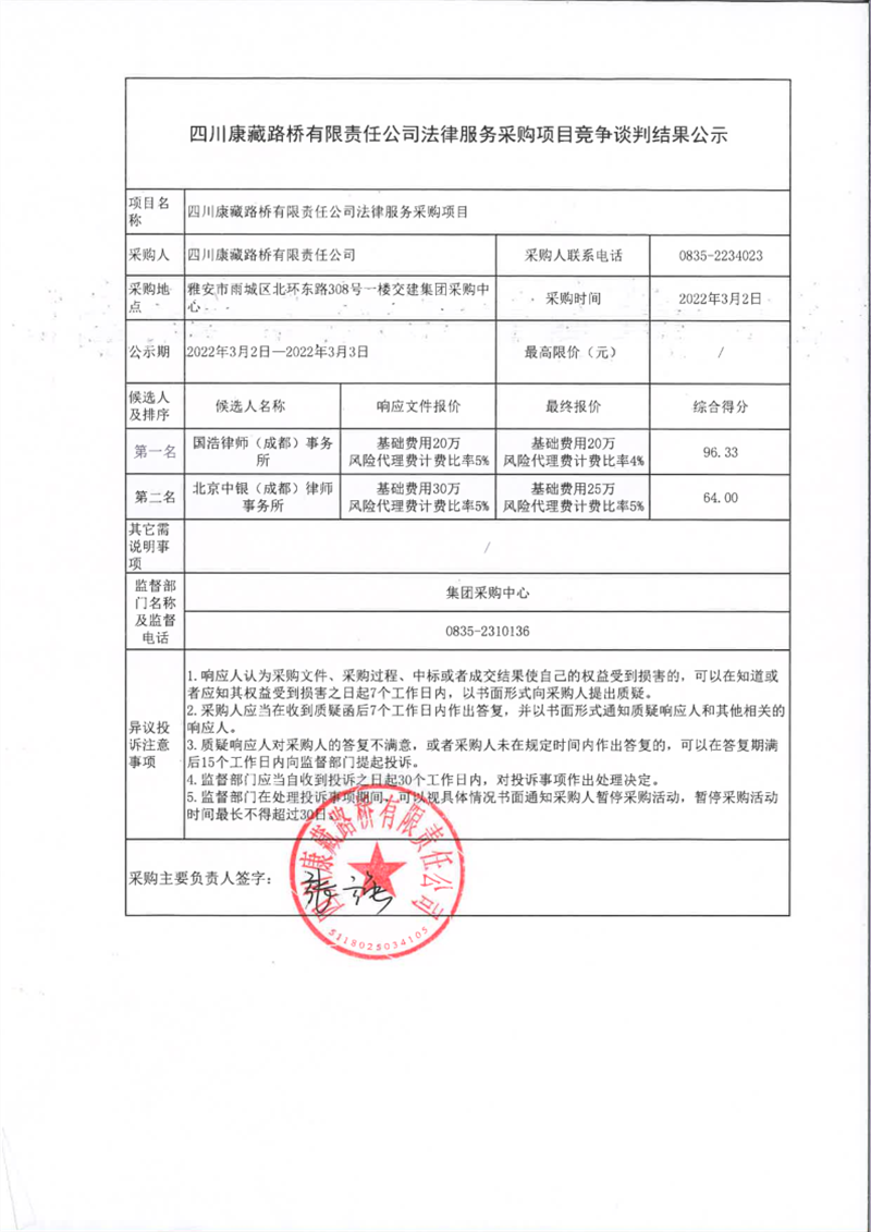 四川康藏路橋有限責(zé)任公司法律服務(wù)采購項(xiàng)目競爭談判結(jié)果公示