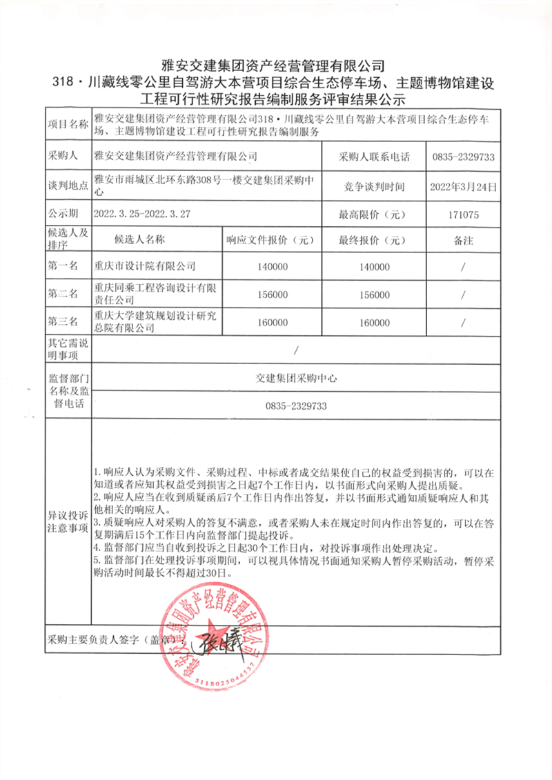 雅安交建集團(tuán)資產(chǎn)經(jīng)營(yíng)管理有限公司318.川藏線(xiàn)零公里自駕游大本營(yíng)項(xiàng)目綜合生態(tài)停車(chē)場(chǎng)、主題博物館建設(shè)工程可行性研究報(bào)告編制服務(wù)評(píng)審結(jié)果公示