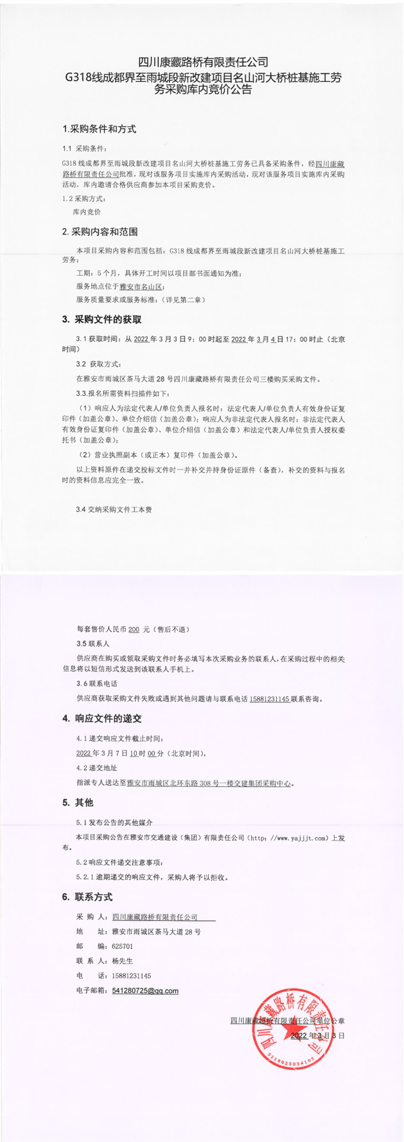 四川康藏路橋有限責(zé)任公司G318線成都界至雨城段新改建項目名山河大橋樁基施工勞務(wù)采購庫內(nèi)競價公告