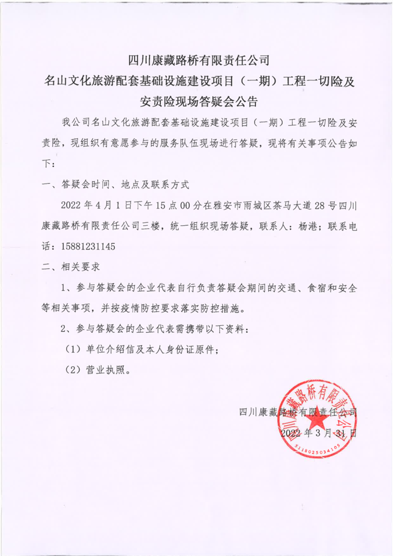 四川康藏路橋有限責(zé)任公司名山文化旅游配套基礎(chǔ)設(shè)施建設(shè)項(xiàng)目(一期)工程一切險及安責(zé)險現(xiàn)場答疑會公告