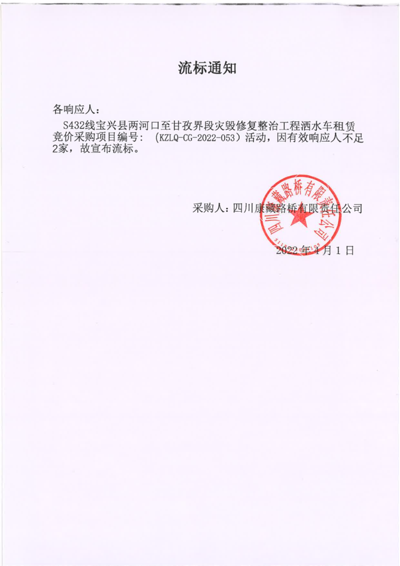 四川康藏路橋有限責(zé)任公司S432線寶興縣兩河口至甘孜界段災(zāi)毀修復(fù)整治工程灑水車(chē)租賃競(jìng)價(jià)采購(gòu)項(xiàng)目流標(biāo)通知