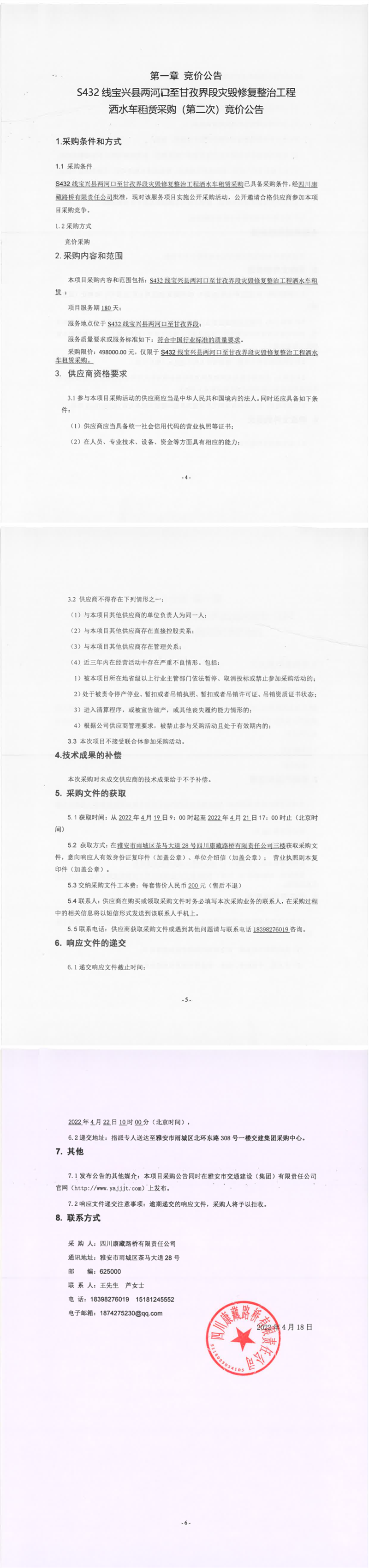 四川康藏路橋有限責(zé)任公司S432線寶興縣兩河口至甘孜界段災(zāi)毀修復(fù)整治工程灑水車租賃采購(gòu)(第二次)競(jìng)價(jià)公告