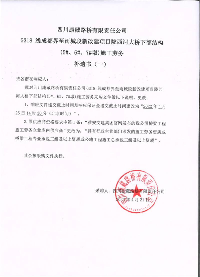 四川康藏路橋有限責(zé)任公司G318線成都界至雨城段新改建項(xiàng)目隴西河大橋下部結(jié)構(gòu)(5#、6#、7#墩)施工勞務(wù)補(bǔ)遺書(一)