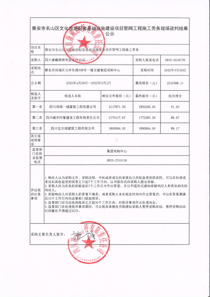 四川康藏路橋有限責任公司雅安市名山區(qū)文化旅游配套基礎設施建設項目管網(wǎng)工程施工勞務現(xiàn)場談判結(jié)果公示
