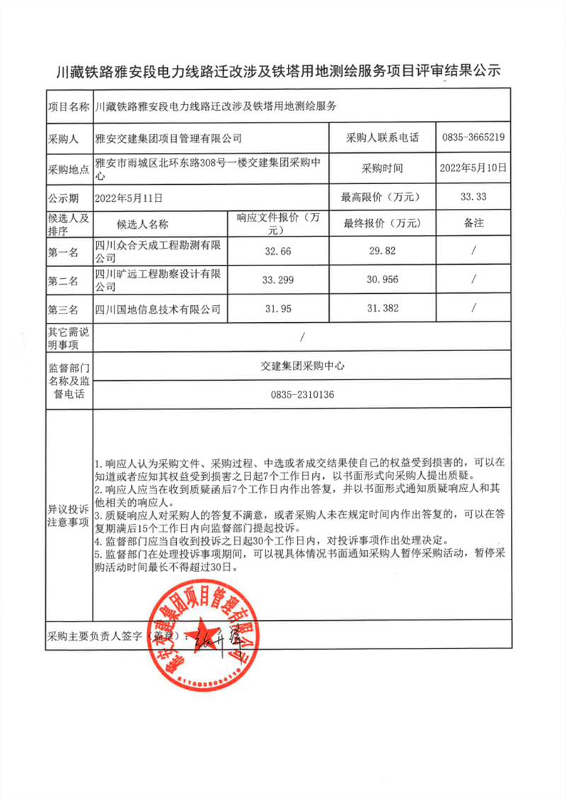 雅安交建集團(tuán)項目管理有限公司川藏鐵路雅安段電力線路遷改涉及鐵塔用地測繪服務(wù)項目評審結(jié)果公示