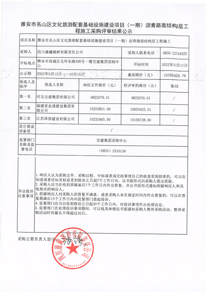 四川康藏路橋有限責任公司雅安市名山區(qū)文化旅游配套基礎設施建設項目(一期)瀝青路面結構層工程施工采購評審結果公示