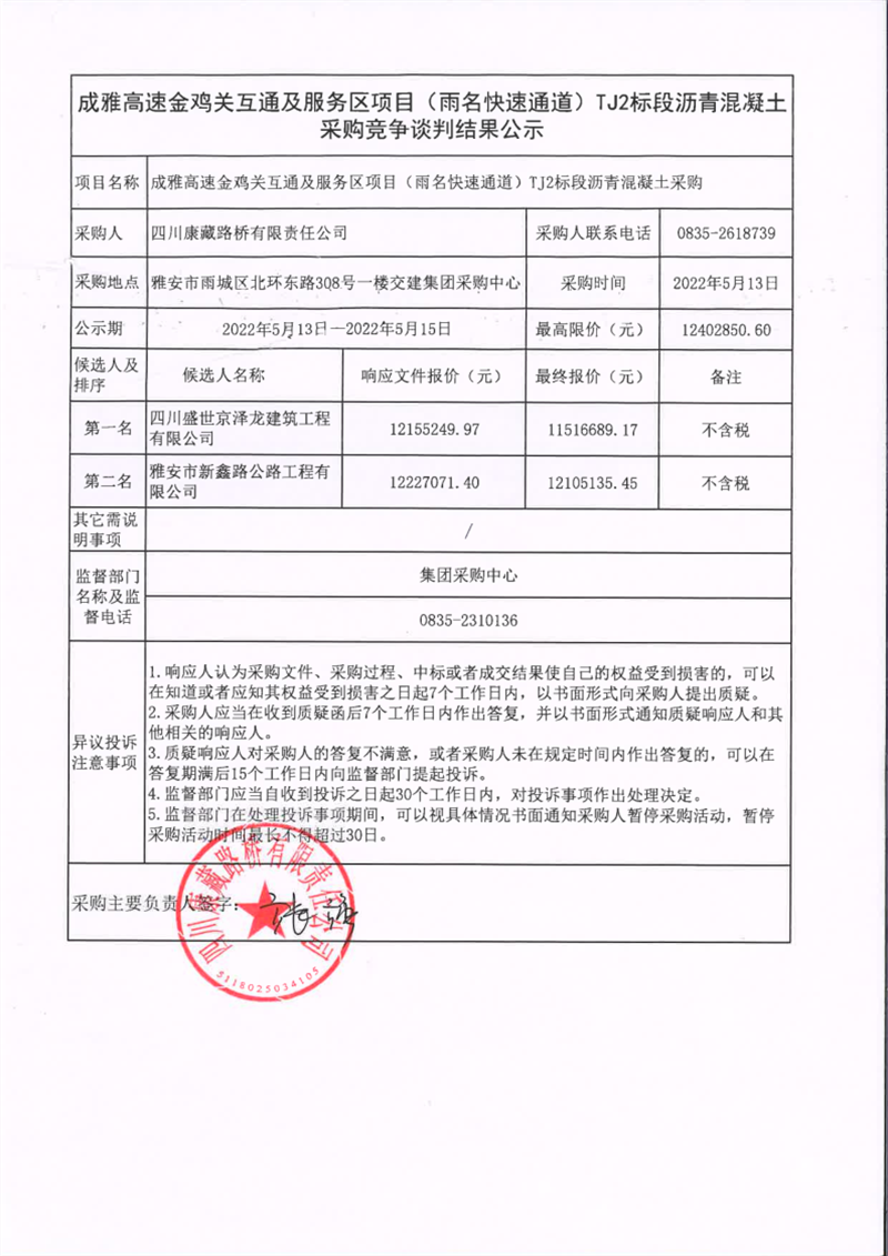四川康藏路橋有限責任公司成雅高速金雞關(guān)互通及服務區(qū)項目(雨名快速通道)TJ2標段瀝青混凝土采購競爭談判結(jié)果公示