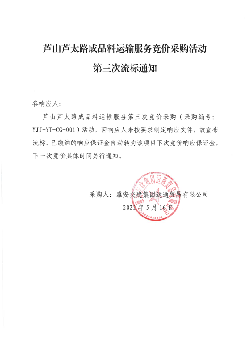 雅安交建集團運通貿(mào)易有限公司蘆山蘆太路成品料運輸服務競價采購活動第三次流標通知