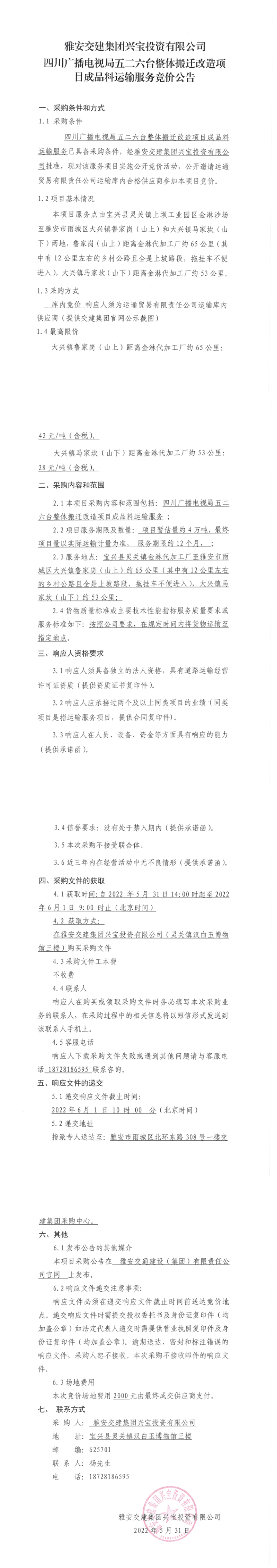 雅安交建集團(tuán)興寶投資有限公司四川廣播電視局五二六臺(tái)整體搬遷改造項(xiàng)目成品料運(yùn)輸服務(wù)競(jìng)價(jià)公告