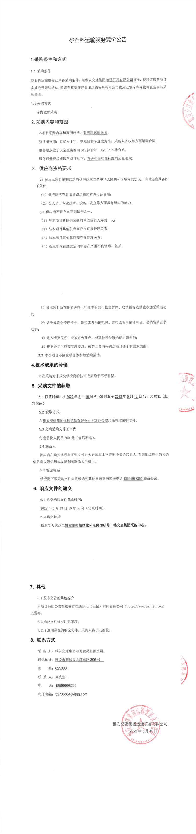 雅安交建集團(tuán)運(yùn)通貿(mào)易有限公司砂石料運(yùn)輸服務(wù)競(jìng)價(jià)公告
