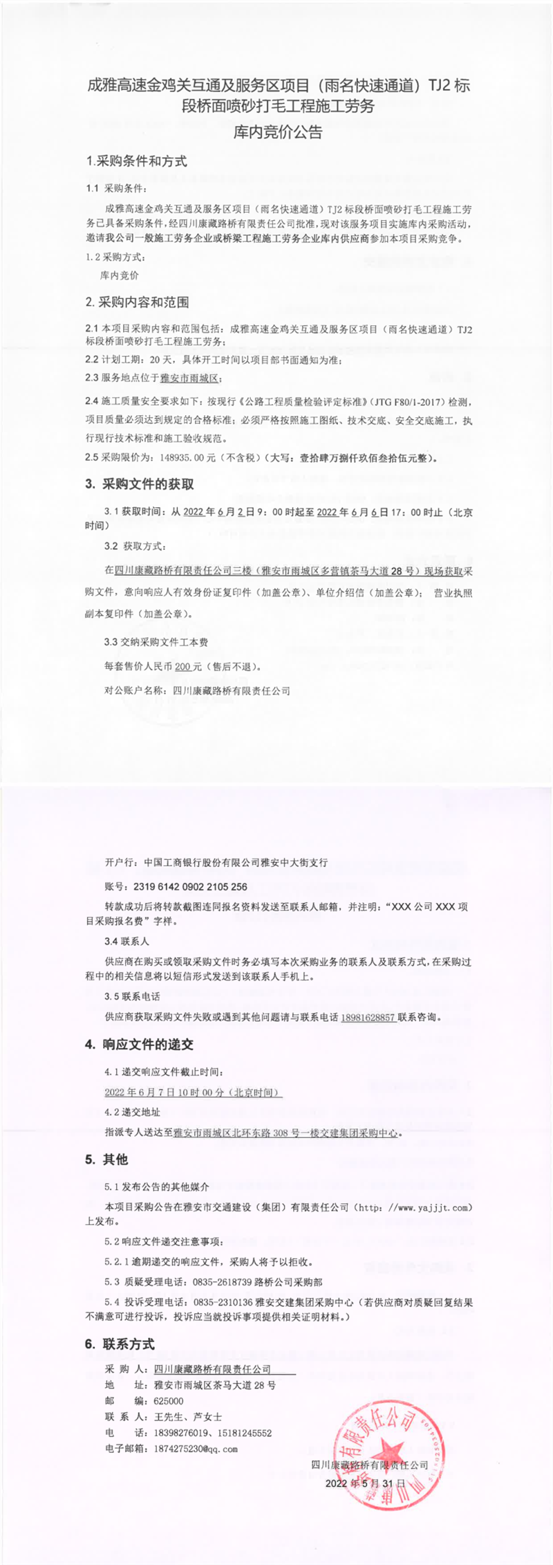 四川康藏路橋有限責(zé)任公司成雅高速金雞關(guān)互通及服務(wù)區(qū)項(xiàng)目(雨名快速通道)TJ2標(biāo)段橋面噴砂打毛工程施工勞務(wù)庫內(nèi)競價公告
