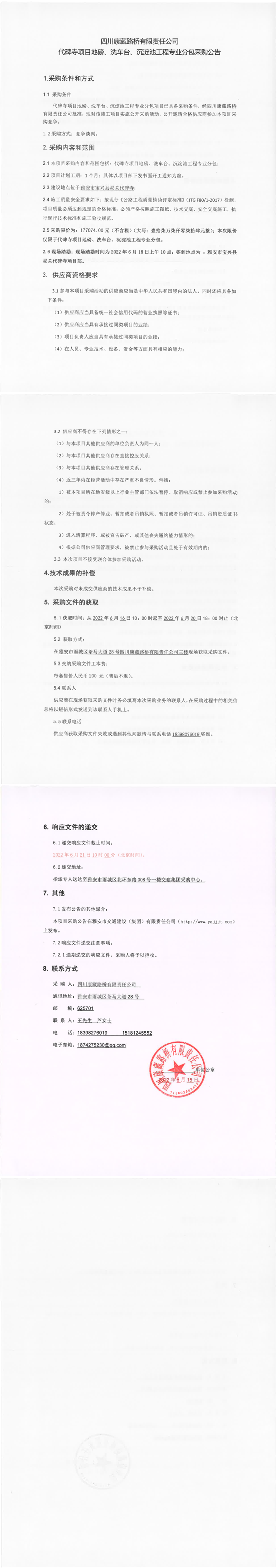 四川康藏路橋有限責(zé)任公司代碑寺項(xiàng)目地磅、洗車(chē)臺(tái)、沉淀池工程專(zhuān)業(yè)分包采購(gòu)公告