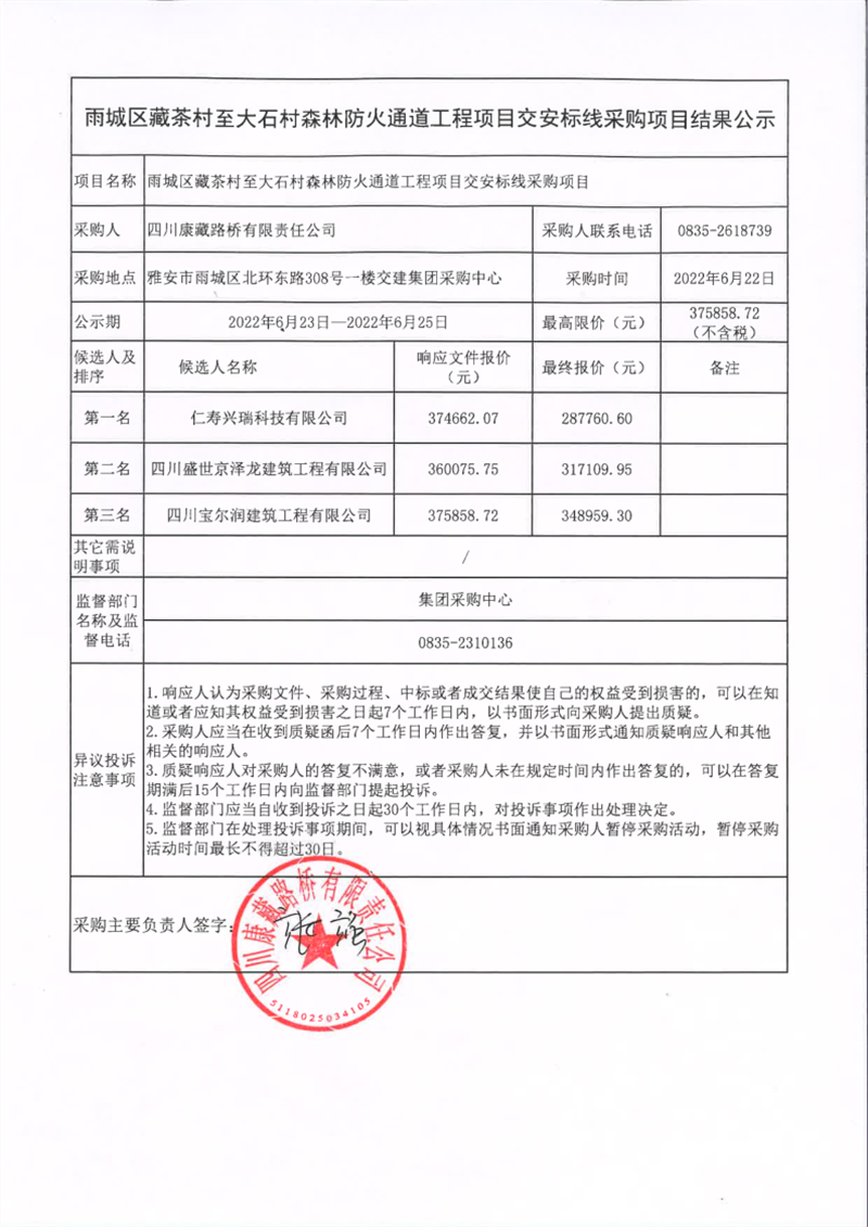 四川康藏路橋有限責任公司雨城區(qū)藏茶村至大石村森林防火通道工程項目交安標線采購項目結果公示
