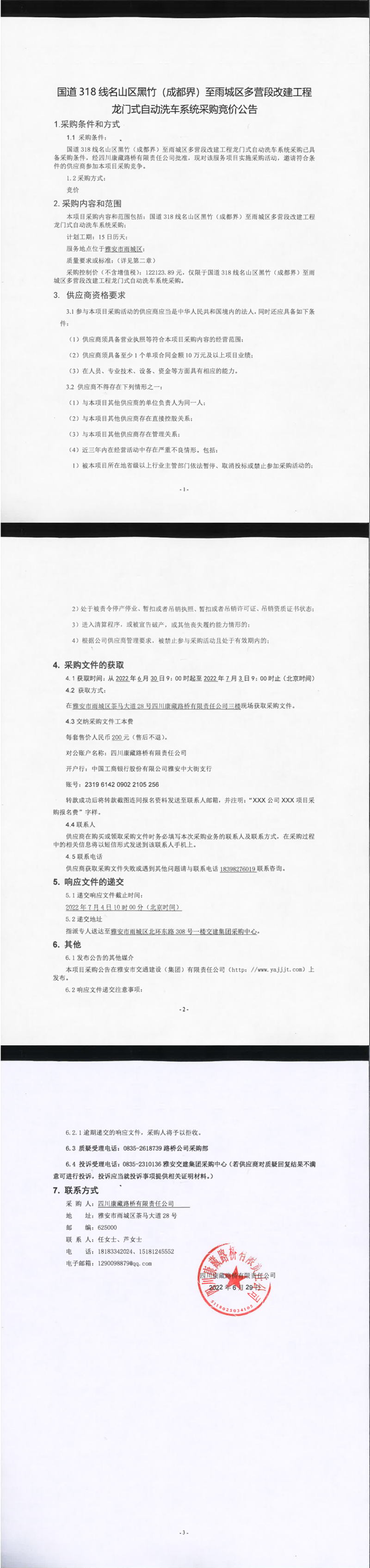 四川康藏路橋有限責(zé)任公司國道318線名山區(qū)黑竹(成都界)至雨城區(qū)多營段改建工程龍門式自動洗車系統(tǒng)采購競價公告