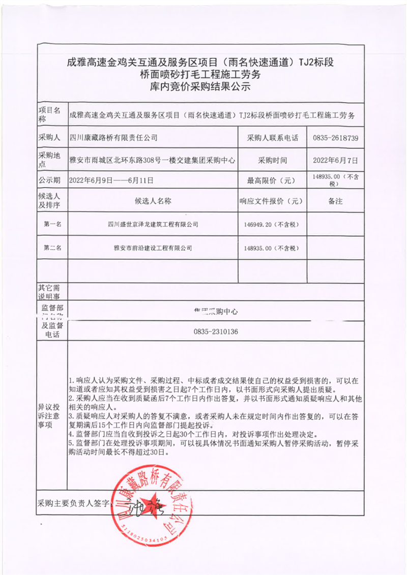 四川康藏路橋有限責任公司成雅高速金雞關互通服務區(qū)項目(雨名快速通道)TJ2標段橋面噴砂打毛工程施工勞務庫內(nèi)競價采購結果公示