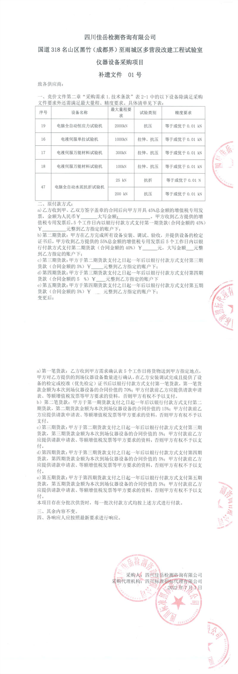四川佳岳檢測咨詢有限公司國道318名山區(qū)黑竹(成都界)至雨城區(qū)多營段改建工程試驗(yàn)室儀器設(shè)備采購項目補(bǔ)遺文件01號