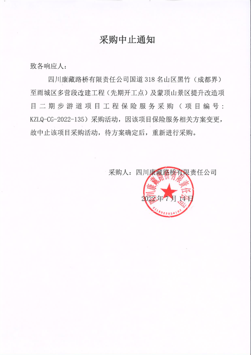 四川康藏路橋有限責(zé)任公司國道318名山區(qū)黑竹(成都界)至雨城區(qū)多營段改建工程(先期開工點)及蒙頂山景區(qū)提升改造項目二期步游道項目工程保險服務(wù)采購中止通知