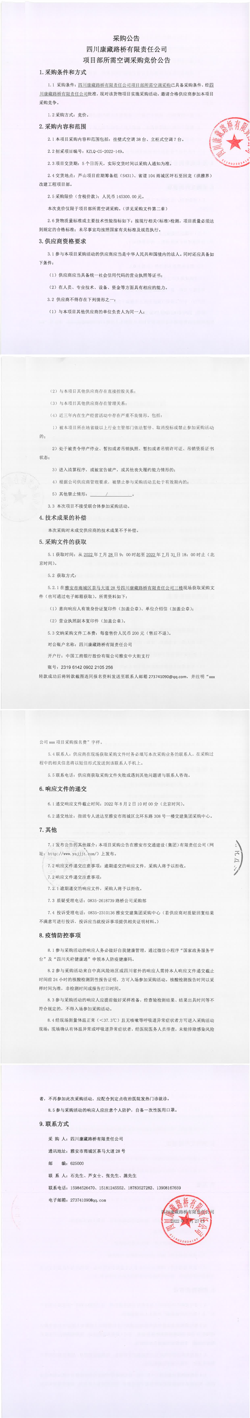 四川康藏路橋有限責任公司項目部所需空調采購競價公告