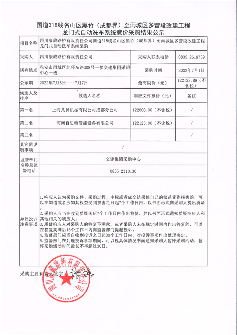 四川康藏路橋有限責(zé)任公司國(guó)道318名山區(qū)黑竹(成都界)至雨城區(qū)多營(yíng)段改建工程龍門式自動(dòng)洗車系統(tǒng)競(jìng)價(jià)采購(gòu)結(jié)果公示