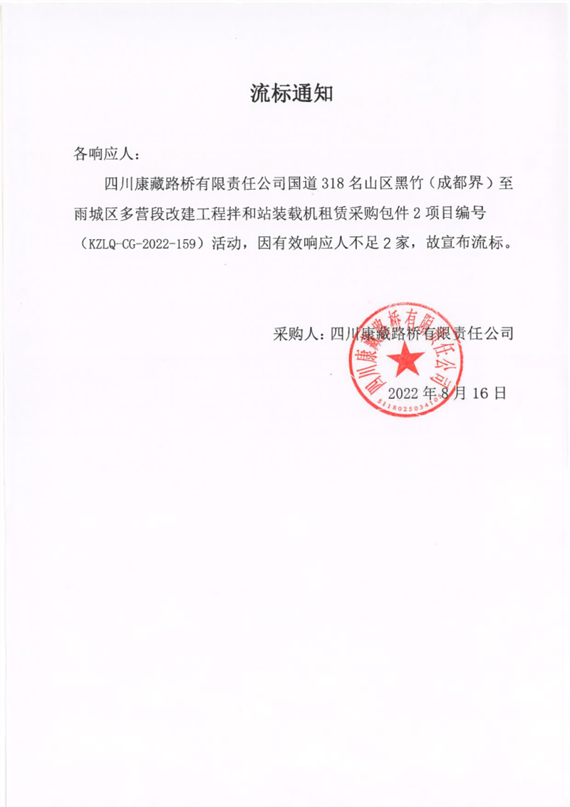 四川康藏路橋有限責(zé)任公司國道318名山區(qū)黑竹(成都界)至雨城區(qū)多營段改建工程拌和站裝載機(jī)租賃采購包件2項目流標(biāo)通知