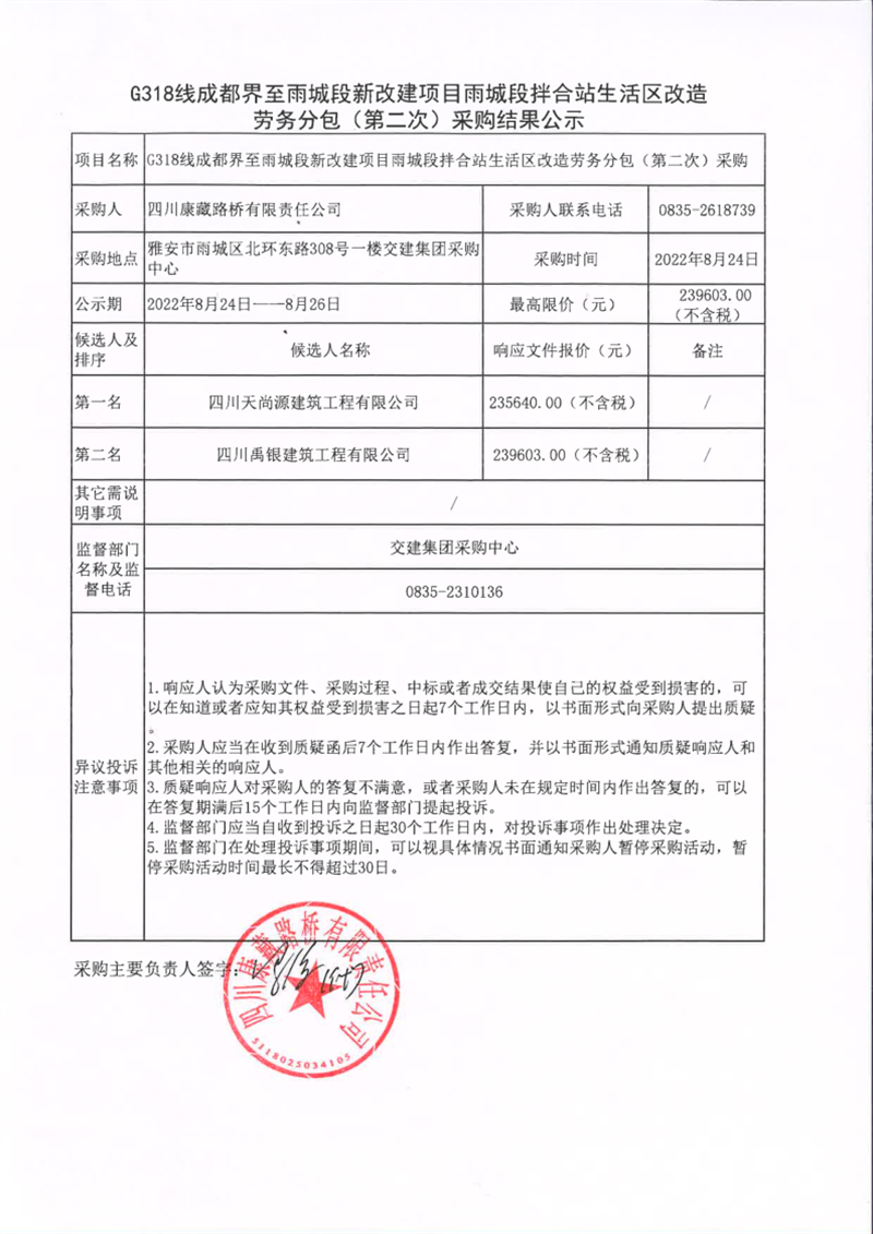 四川康藏路橋有限責任公司G318線成都界至雨城段新改建項目雨城段拌合站生活區(qū)改造勞務分包(第二次)采購結果公示