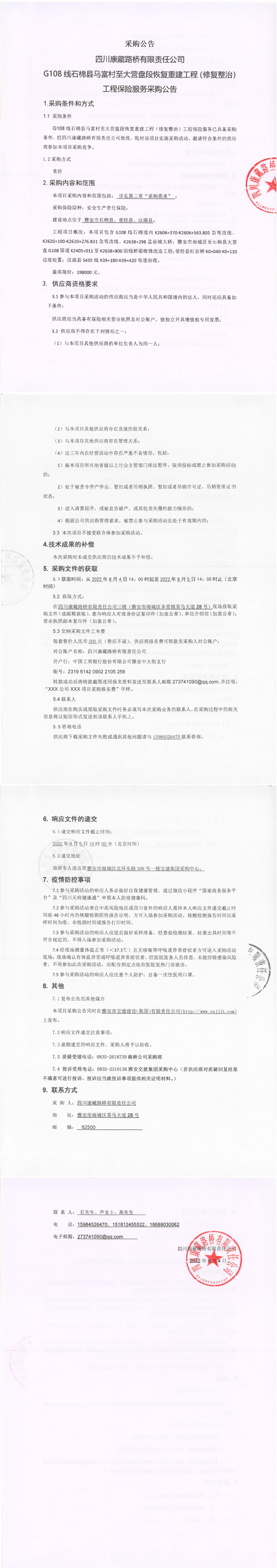 四川康藏路橋有限責(zé)任公司G108線石棉縣馬富村至大營(yíng)盤段恢復(fù)重建工程(修復(fù)整治)工程保險(xiǎn)服務(wù)采購公告