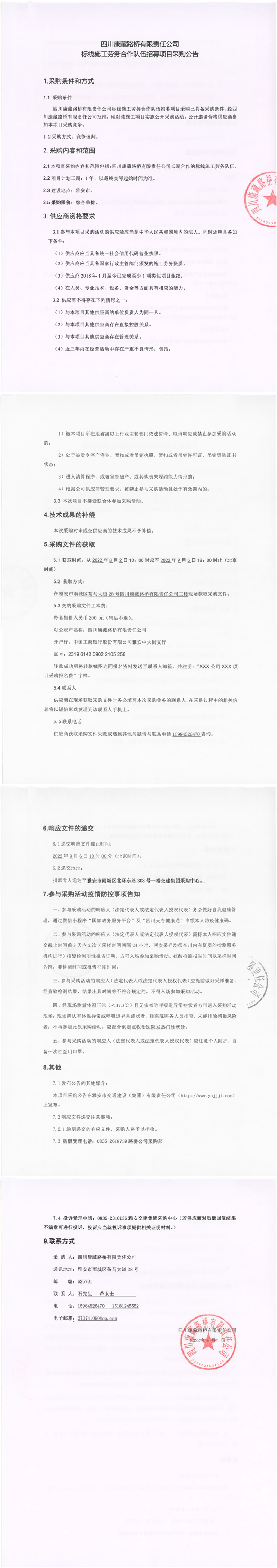 四川康藏路橋有限責(zé)任公司標(biāo)線施工勞務(wù)合作隊伍招募項目采購公告