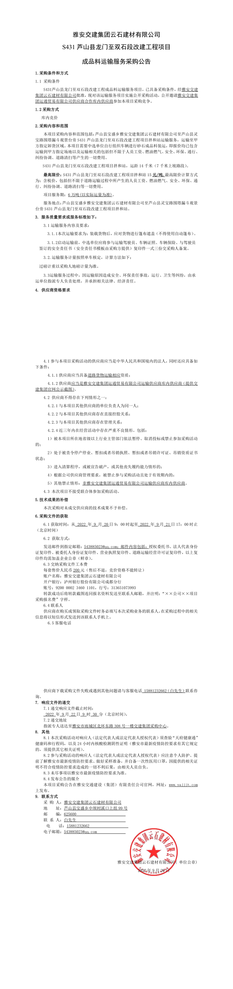 雅安交建集團(tuán)云石建材有限公司S431蘆山縣龍門至雙石段改建工程項目成品料運(yùn)輸服務(wù)采購公告