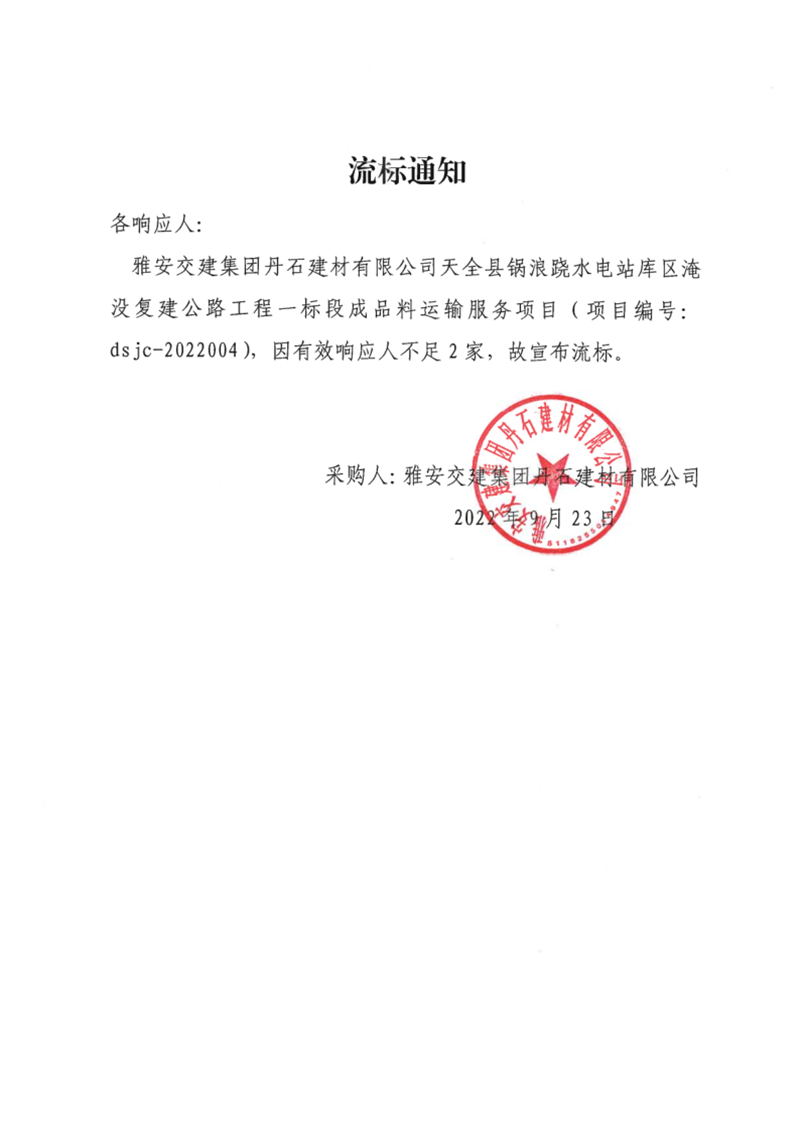雅安交建集團丹石建材有限公司天全縣鍋浪蹺水電站庫區(qū)淹沒復建公路工程一標段成品料運輸服務(wù)項目流標通知