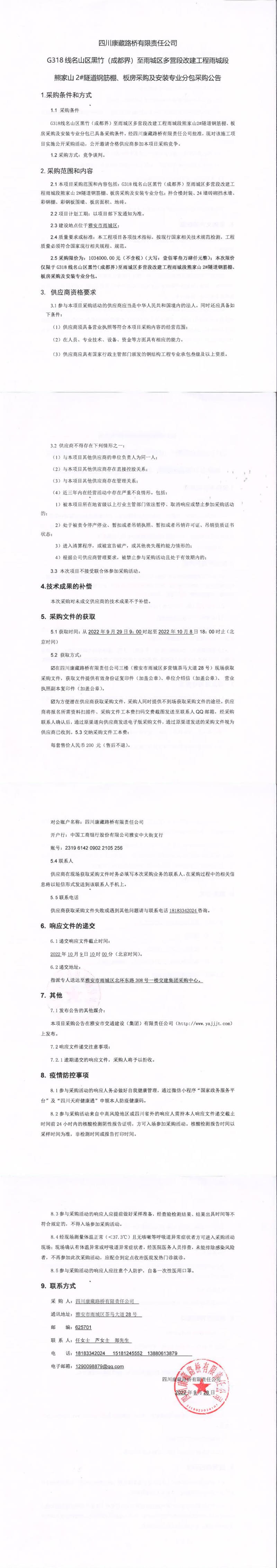 四川康藏路橋有限責(zé)任公司G318線名山區(qū)黑竹(成都界)至雨城區(qū)多營段改建工程雨城段熊家山2#隧道鋼筋棚、板房采購及安裝專業(yè)分包采購公告