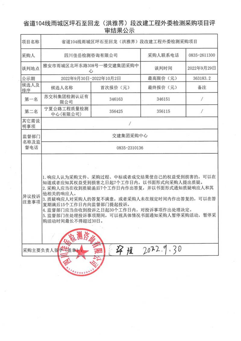 四川佳岳檢測咨詢有限公司省道104線雨城區(qū)坪石至回龍(洪雅界)段改建工程外委檢測采購項(xiàng)目評審結(jié)果公示