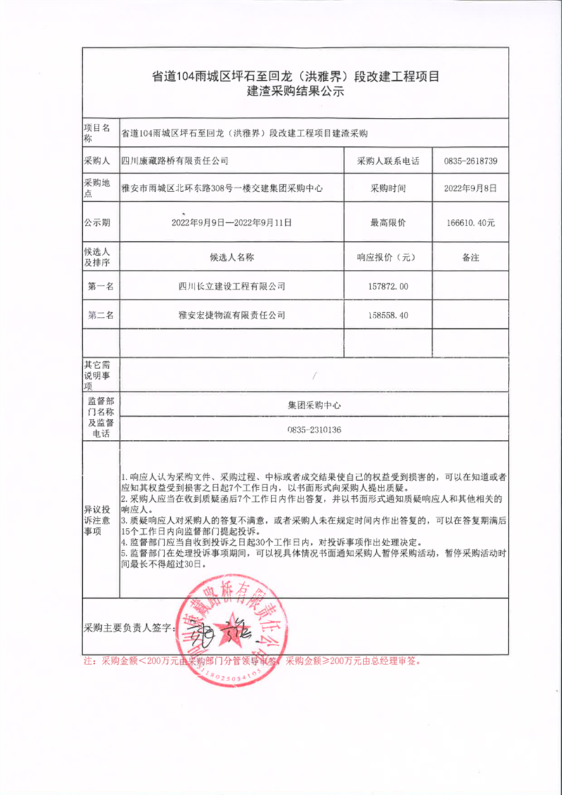 四川康藏路橋有限責(zé)任公司省道104雨城區(qū)坪石至回龍(洪雅界)段改建工程項(xiàng)目建渣采購(gòu)結(jié)果公示